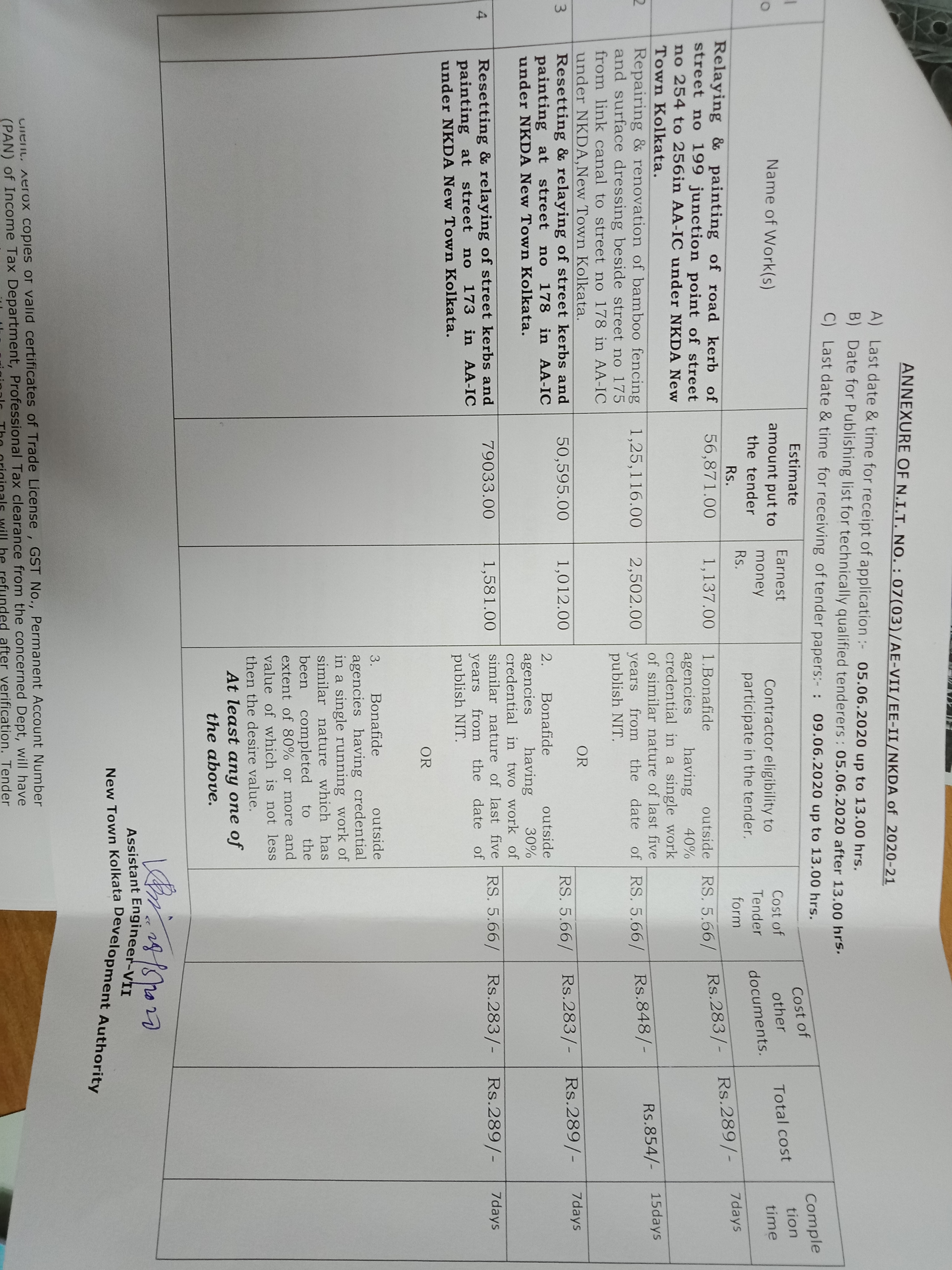 | NIeT NO : 26/5/WBNKDA/EE-V/2023-24 | 05-10-2023 | 10-10-2023 | Cleaning, priming and painting in the surface of road kerb in the eve of festive season along the roads 240,199,211,254 in AA-IC, under EE-V, NKDA, New Town, Kolkata 2.Cleaning, priming and painting in the surface of road kerb in the eve of festive season along the roads 256,189,244,233,242,175,184,173,171 in AA-IC, under EE-V, NKDA, New Town, Kolkata 3.Cleaning, priming and painting in the surface of road kerb in the eve of festive season along the roads 131,166,165,174 in AA-IB, under EE-V, | Download | |||